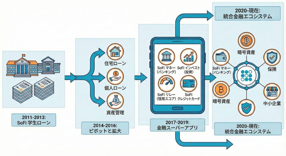 彼らはビジネスのカテゴリーを猛スピードで転換(ピボット)させたのです。 その結果、学生ローン一本足打法から脱却し、預金・投資・カード・ローン、全てができる**「金融のワンストップ・ショップ」**へと進化を遂げました。