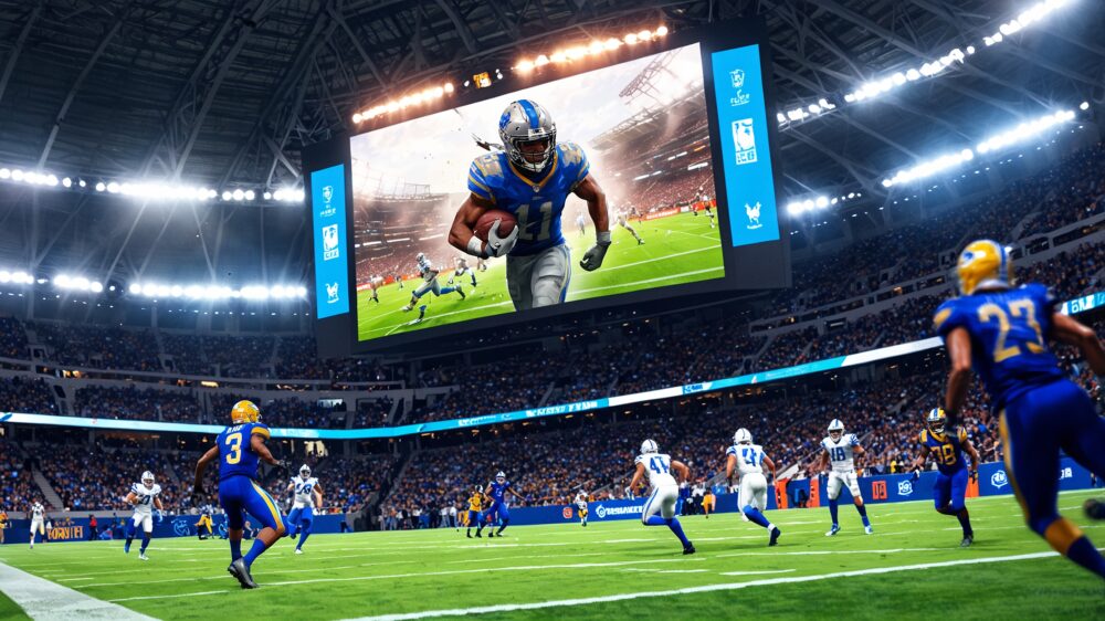 キッカーがボールを蹴り込む、あの緊張の一瞬。 ポールの後ろにあるネットに、「SoFi」の巨大なロゴが鮮やかに映し出されるんです。